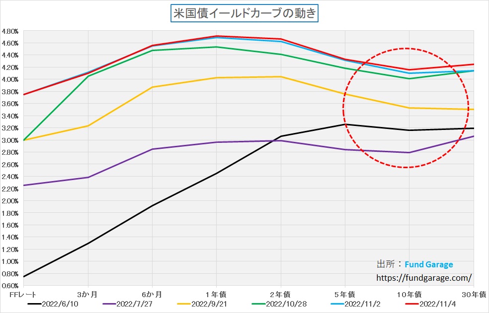 下のイールドカーブ・チャートに、前週末(10月28日)、4回連続の0.75の利上げが発表された11月2日、そして先週末11月4日のカーブの推移を示してある。まず明らかなことは、短期金利は利上げの都度、当然のように反応しているが、長期金利は4%少々のところで留まっていること。これが景気のリセッション懸念を織込んでいるものなのか、或いは利上げペースのピークアウトからその後の利下げを読んでのものなのかを判断するのは難しいが、少なくとも景気に対する失速懸念を抱えながら走っていることだけは明らかだろう。景気の先行きにインフレの更なる過熱を煽るような兆候を市場は見ていないということだ。当然のことながら、債券市場はパニックにはなっていない。