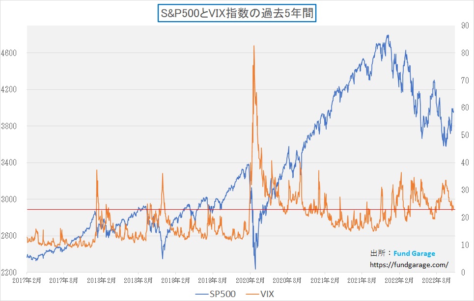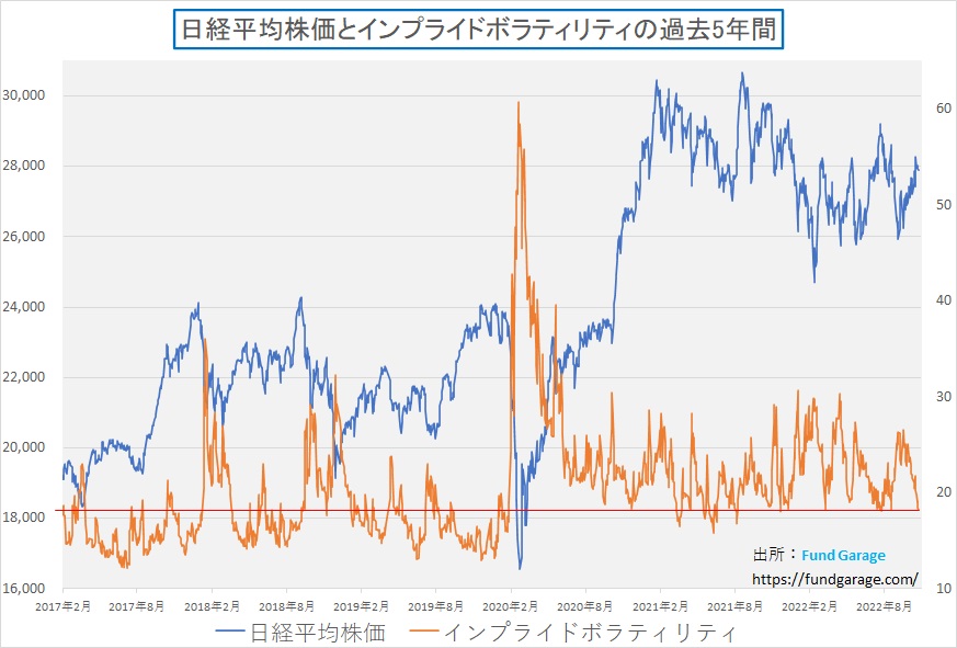 例えば日経平均のそれを株価を合わせて表記すると、下記のようになる。ご覧いただける通り、2020年のパンデミック騒ぎで株価が急落した時以降ではほぼほぼ安値圏だ。