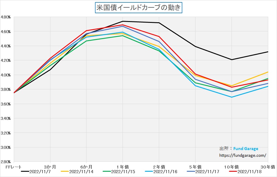 下に示したのは前週から先週にかけての毎日のイールドカーブの変遷だ。黒線が一番古い11月7日、16日に最も低下して、週末は赤線となる。