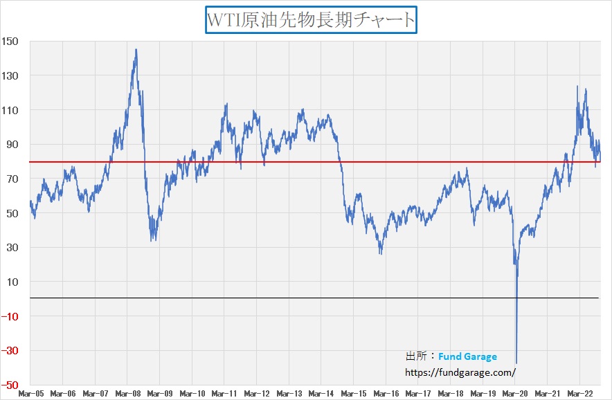 インフレの原因は主として人件費の高騰と燃料代の高騰と言われているが、下のチャートを見て、少なくとも燃料代の高騰という問題は心配し過ぎな気がしてならない。勿論、環境問題に傾倒しつつこのチャートを見ても、そもそも原油は天然ガスと共に環境にやさしい燃料ではないとされて、需要は下がり続けるものと捉えられがちだが、昨今の世界的な異常気象は再生可能エネルギーの普及シナリオの書き換えを求めており、そうそう簡単に夢物語のようなエネルギー転換は起きそうもない。ならば、この原油価格の下落はインフレ対応に頭を悩ます各国中央銀行にとっては寧ろ朗報の筈だ。