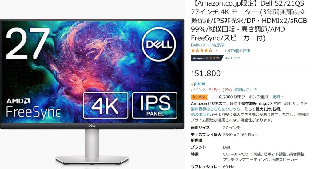 日常私が使っているパソコンはモニターを2枚接続しDualモニターで使っているが、今回購入したのはDELL製の4K対応の27インチ・モデル(下記写真のもの)。ゲーマーでは無いのでリフレッシュレート(毎秒何枚の絵を書き換えることが出来るかを示す)は通常のオフィス用途である60Hzで充分(毎秒60回、ゲーム用だと120Hzや240Hzが求められる)と考え、細かい数値や文字をいつも見ているので、画質をFHDよりも更に高精細となる4K対応のものとした。