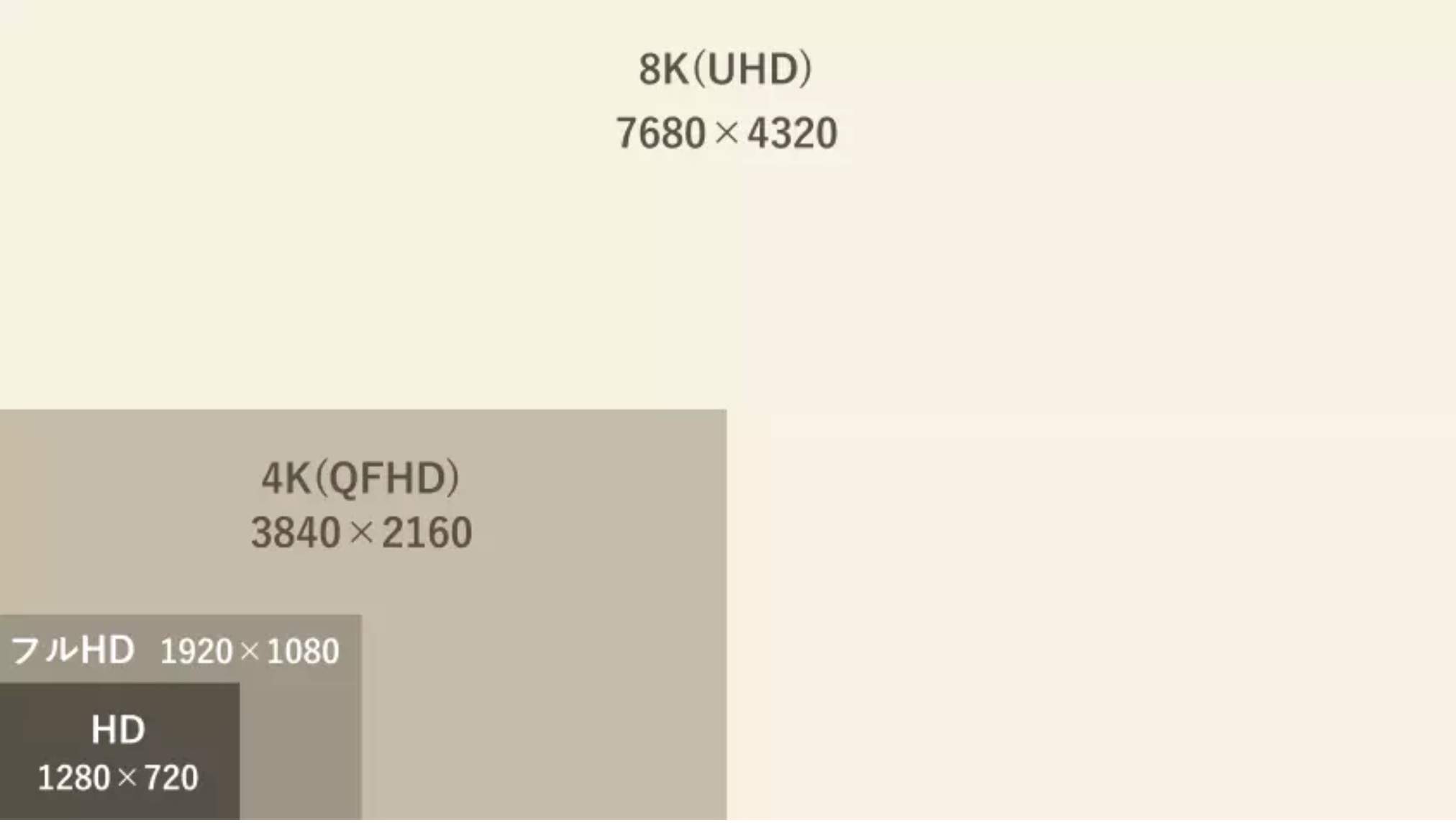 因みに、アナログ放送だと横640×縦480=310,000個(SD画質)と実に4Kに比べると約26.5倍も肌理が粗いことがわかる。かつて地上波デジタルが導入された時はその画像の美しさに驚いたが、数字で言うと1440×1080となり、ピクセル数で言うと1,555,200個。つまりアナログ放送の約5倍の情報量を持つようになったということだ。ただそれでもまだフルハイビジョン(FHD)の1920×1080よりも情報量は少ないのだから驚くかも知れない。また気付かれたと思うが、実は縦の数が同じままで横の数だけが増えていることもある。昔のテレビドラマが最近のテレビでは両サイドに黒い帯が入るのはこのためだ。そして前述したように、4Kになると更に3840×2160となり、8Kだと7680×4320と更に4倍になる。イメージするとしたの図のようになる。
