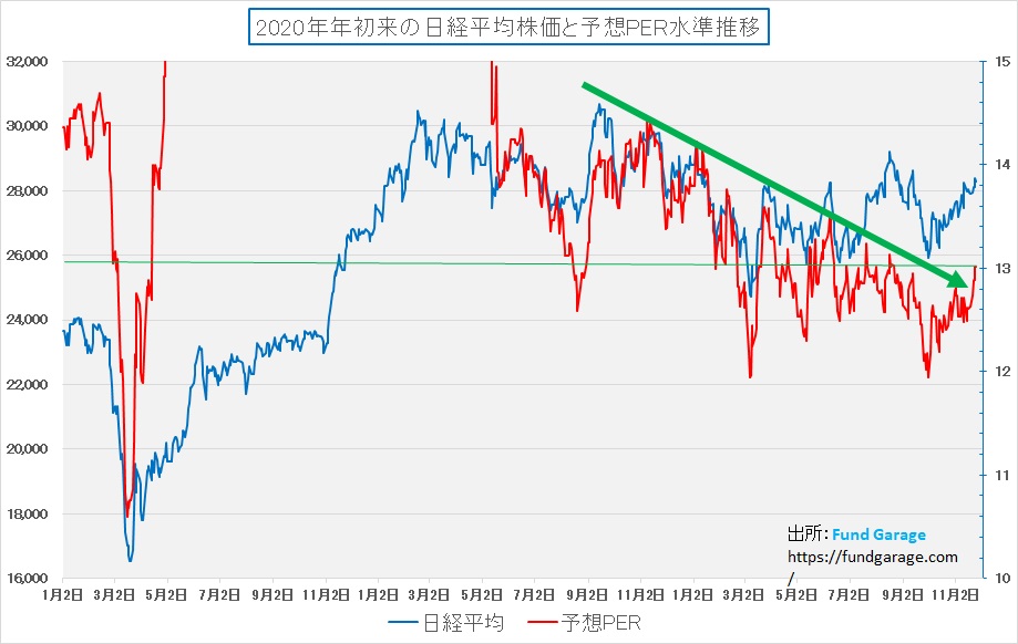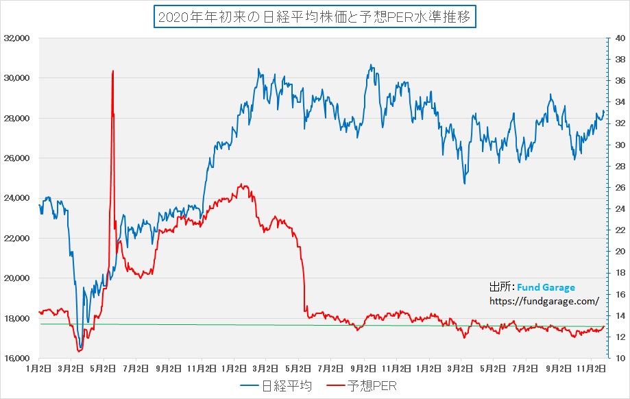 ただ来期予想をベースとしたPER水準は基本的に最もシンプルで、そして歴史が長く、普遍的に使える最も身近なバリュエーション指標だ。そこで足元の予想PER水準の推移を確認すると、面白いことが見えてくる。まず下記のチャートを見て頂きたい。これは2020年年初来の株価とPERの比較チャートだが、足許で株価が上昇していることもあり、ジワジワとPERのカーブも上向きに上昇してきている。株価がこのチャートの中で一番高い時は2021年9月14日、日経平均株価は30,670.10円だった時だ。当然その頃のPERは今よりも高いが、このチャートだとあまり判然と見分けはつかないかもしれない。