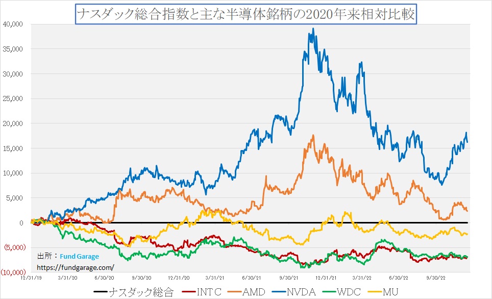 まずアップル(AAPL)の株価迷走の理由は中国のゼロコロナ政策関連の話題に答えを求められるだろう。要は生産が遅れ、また景気悪化の中で中国の購買力が落ちるというシナリオだ。その見立てで、このところパフォーマンスの悪いウェスタンデジタル(WDC)やアドバンスドマイクロデバイス(AMD)のパフォーマンスも説明することが出来る。要は「中国」が停滞することで、スマホやパソコンと言った量販モノの販売数量の増減が大きく収益に影響する。パソコンやスマホ関連ビジネスの中では勝ち組も売られていることは、間違いなく最終局面だとも言えそうだ。