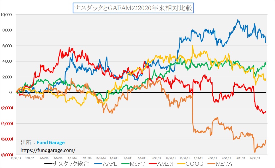 その中身を調べると、まず対ナスダックの相対パフォーマンスとして時価総額最大のアップル(AAPL)の相対パフォーマンスが悪化している。それに対して、メタプラットフォームズ(META)やアマゾンドットコム(AMZN)はナスダックに対して反発し、マイクロソフト(MSFT)とアルファベット(GOOG)は可もなく不可もなくといった按配だ。