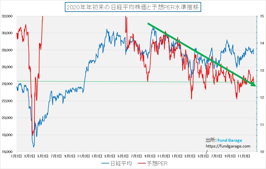 例えば企業の解散価値の計算に寄与するものと言えば、当然一株当たりの利益であるEPSであり、その「何年分」を市場が読み取っているかを示す指標がPERだ。つまりPERの高低は「市場が何年先までを期待しているか」を示す指標として捉えることが出来るが、市場指数の予想PER水準が低下するということの意味は、「市場が将来を悲観している」或いは「リスク回避的になっている」とネガティブな捉えることも出来るが、それこそ「割安」な銘柄が増えているとポジティブに捉えることが出来る。下のチャートは緑の矢印で示した通り、明らかに昨年夏以降、市場が前述のような傾向にあることを示している。もし右側Y軸(予想PERの目盛り)が1倍変動すると、企業収益の変動に関係なく、日経平均株価は約2200円変動する。