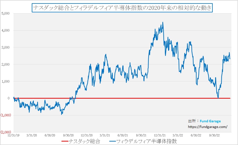 両指数間の差分を取ったチャートだと下記の通り。どちらかと言えば、フィラデルフィア半導体指数の方がより下落しているので、半導体関連銘柄のパフォーマンスが悪かったとも言える。