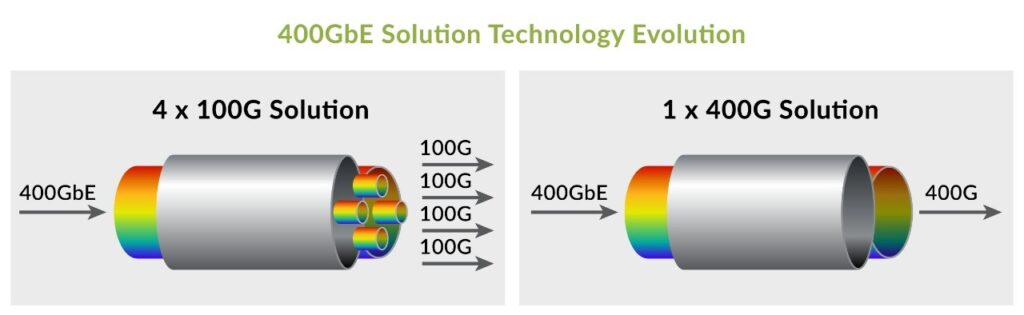 400Gは、一般的には、1つの 400Gの波長で400Gの容量を提供するソリューションを指す。この400Gは、文脈に応じて、400GbE、400Gb/sと置き換えることが出来る。400GbEは、1つのリンクを介して転送できる、イーサネットインターフェイスの容量を指す。これは、400GbEの物理層、管理パラメーター、メディアアクセス制御(MAC)パラメーターが従うべき、承認されたIEEE 802.3bs規格に基づいている。400Gb/sは、データが転送される速度を指す。この場合、1つの光波長を介して毎秒4,000億ビットの情報が転送される。