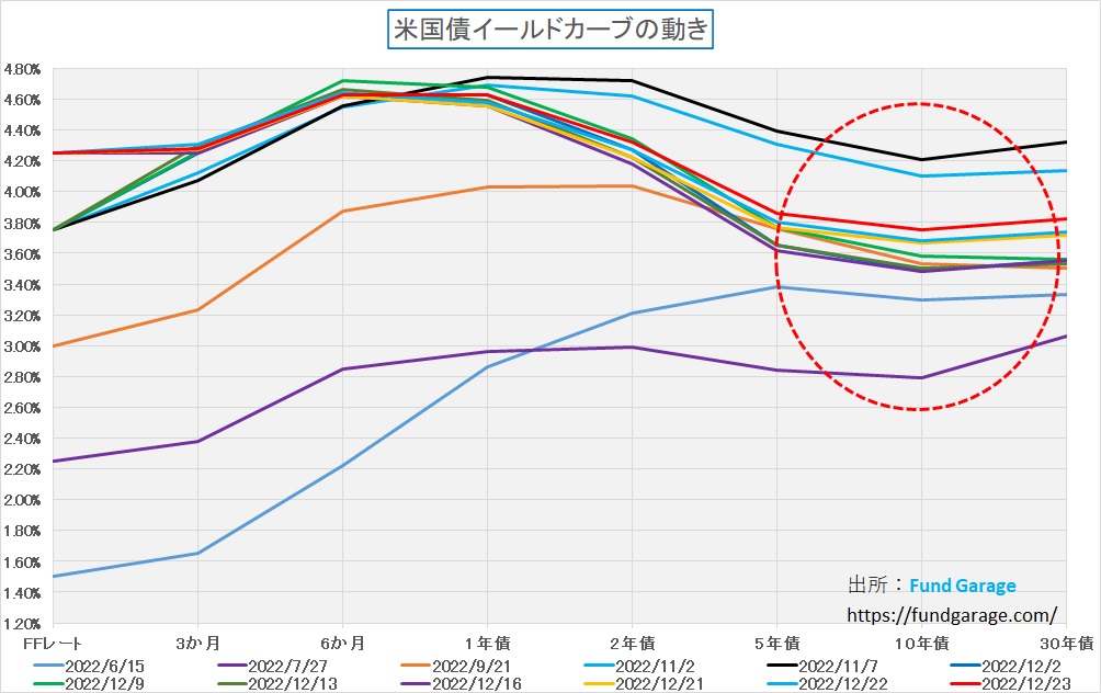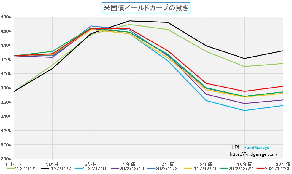 やはり一番の注目はFFレートの誘導水準の引き上げと、10年債利回りの推移だろう。現状の10年債利回りは9月21日のFOMCで0.75%の利上げが行われた時の水準にほぼ等しく、FRBはその後11月に0.75%の利上げ、そして12月にも0.50%の利上げを行い、それでも尚、来年も利上げせざるを得ないという話をしている。9月の時のイールドカーブがそのまま形状を維持したままであるべきだとすれば、今の10年債利回りは0.75%+0.50%=1.25%の上方修正をしないとならない。だが9月のイールドカーブでも6月の頃に比べると、かなり強く長短金利の逆転が起きている。