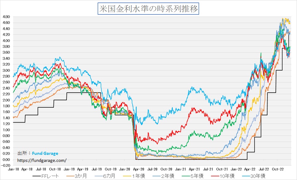 この通り長期金利は多少動いているが、基本的なイールドカーブの形状変化は起きていない。つまりリセッションの程度判断については日々マクロ指標などによって変更はあるものの、基本的にリセッションだという考え方は変わっていない。因みに精緻に確認すると、前週末16日と先週19日に始まった週を見ると、徐々に10年債利回りが上昇している。前週末が3.48%で先週末が3.75%なので、0.27%の修正が行われたことになる。だがFFレートの誘導水準下限は4.25%であり、6か月と1年の利回りは4.63%となっている。一方で、紫色で示した11月7日には、1年債利回りが4.74%、2年債利回りが4.72%だ。お分かりだろうか、マイクロンテクノロジー・ショックで半導体関連銘柄の下落で株式市場のムードが悪化したにもかかわらず、債券市場ではやや長期金利が上昇している、すなわち長短逆転の度合いは緩んだということだ。長期金利が上昇するというのは、どういう意味だろうか。