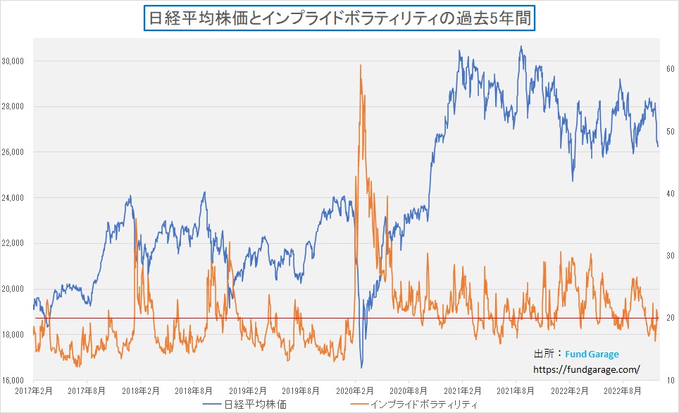株価が急落するような局面、或いはリスクを感じてヘッジニーズが高まるような局面では、このインプライド・ボラティリティは通常は大きく上昇する。逆に変動リスクが減ってくれば、オプション・コストを払ってまでも、意図せぬ方向へ動くことをヘッジする必要も無い。海外旅行に行くからこそ旅行傷害保険を契約するのであって、旅行もしないのにこの保険を掛ける人は居ないのと、ある意味同じ感覚だ。