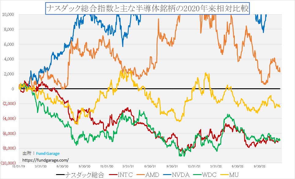 マイクロンテクノロジーの決算説明で明確にCEOがコメントしていることは、基本的にはエンドマーケットの需要が緩んでいるということだ。だがメモリー半導体の主戦場はパソコンであり、スマホだということが重要だ。逆にデータセンタなどの需要が明確にダウンターンに入ったとは言っておらず、また自動車関連などは急増していることを伝えている。すなわち既知の事実に基づく状況のアップデートでしか無かったということ。下記のチャートがいつものナスダックに対する半導体チップ・メーカーの株価推移だが、この3年間、勝ち組と負け組は明確に分かれてきた。
