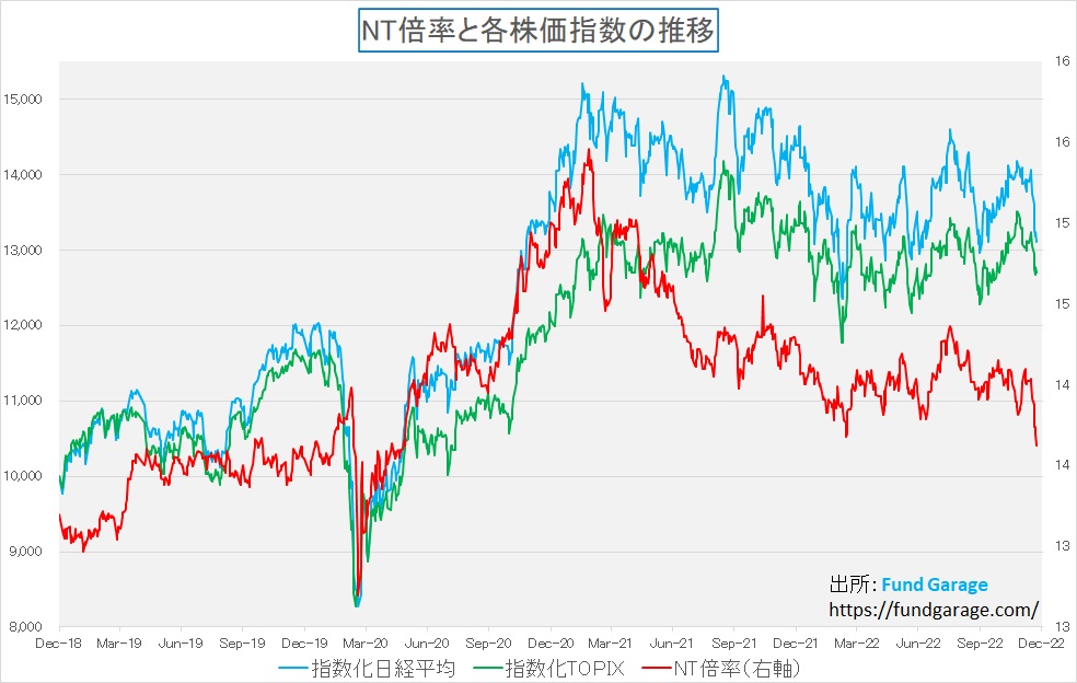 まずはいつものNT倍率(日経平均÷TOPIX)だ。先週末のNT倍率は13.82倍となって2020年5月27日以来の安値を付けた。すなわち対TOPIX(市場全体の時価総額)で日経平均はより大きく下落したことになる。それは指数の計算式の関係上、日経平均はファストリテーリング(9983)、キーエンス(6861)或いは東京エレクトロン(8035)など値嵩株の影響を受け易いからだ。だから市場全体の動きという意味ではTOPIXの方が適切なインデックスだと言われるのだが、仮にパンデミック後のNT倍率の最高値となった2021年2月25日の15.66倍を基準として現状のTOPIXを類推すると、日経平均29,721円前後(1897.94×15.66)の時と同等の水準にTOPIXがあると言うことも出来る。別な言い方をすると、日経平均は何らかの要因で、無理に押し潰されているという見立ても出来なくはない。