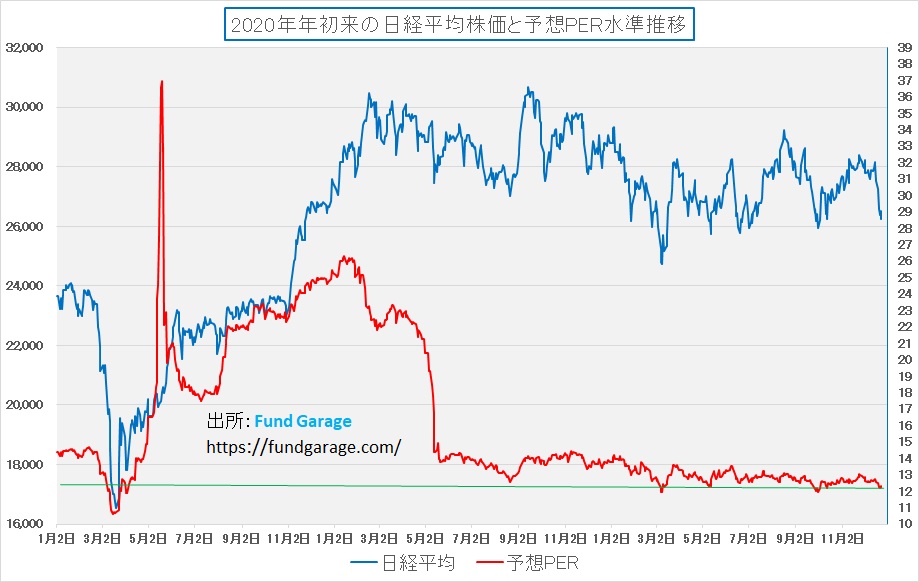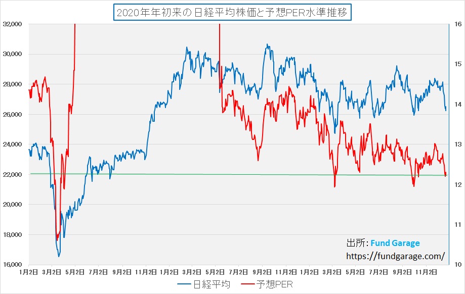 ならば、株価の基本であるバリュエーション、一番基本的で代表的な予想PERの水準から見てみると、下記のような状態となる。まずはコロナ禍のパンデミック騒動が起きる前の2020年1月初めからのPER推移を見る。分かり易いように12月23日の水準のところに緑色のラインを入れておいたが、状況はパンデミックでこの先どうなるか分からないと、かなり悲観的になった時に次ぐ水準にまで予想PERが下落しているのがわかる。つまり割安になっているということだ。