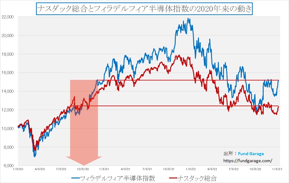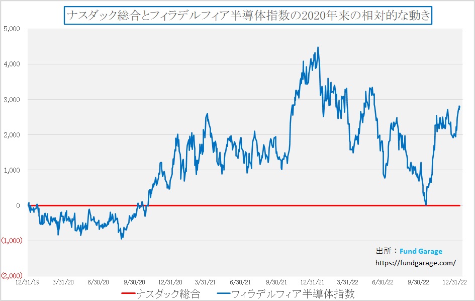 まずはナスダックとフィラデルフィア半導体指数の実数ベースでの相対比較のチャートはこんな感じになっている。