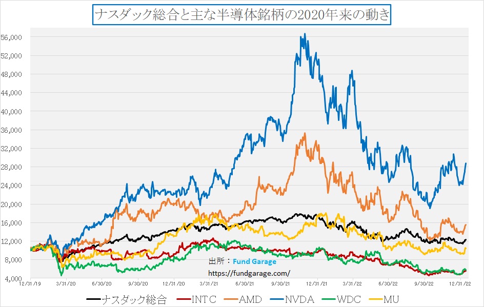 このアウトパフォームの主役は何と言ってもエヌビディア(NVDA)だ。ナスダックもフィラデルフィア半導体指数も時価総額加重平均型である以上、時価総額が大きいエヌビディアの貢献度合いは高く、主力半導体チップ銘柄を比較した下記チャートからも、その好調さが分かる。