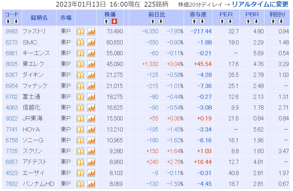 圧倒的に日本企業の中で時価総額大きいトヨタ自動車(7203)の株価はこのひと月で約8.3%も減少した。ただ値がさ株ではない同社の株価が日経平均に与える影響は微々たるもの(ファーストリテイリングの約37分の一程度)だ。因みに、日経平均寄与度のランキングは下記の通り。