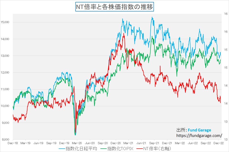 ただ時価総額加重平均で計算されるTOPIXへの寄与度は断トツで高い。だが両指数の相対値を比較するNT倍率で見ると、不思議なことに日経平均の方が下落していることが分かる。ということはどういうことかと言えば、日経平均に寄与度が高い、ファーストリテイリング(9983)や半導体関連などの値がさハイテク株も同時に売られているということだ。なぜ極端にNT倍率が低下しているのが不思議でならない。