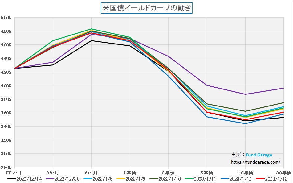 一方で、短期金利の方はCPI発表前までは0.50%の利上げも止む無しとばかり上昇していたが、CPIの結果を見て、0.25%の利上げ織り込みへと変化した。これは1月11日の緑の線と、13日の赤の線の3か月のところを見てもらえるとよくわかる。つまり、債券市場はやはり冷静にインフレ動向を見ているということ。「シェルターの前月比が・・・」みたいな因縁はつけていない。ただ為替市場の動きはやや誇張気味な気がしている。つまりここまで円高に動くような内容ではないということだ。