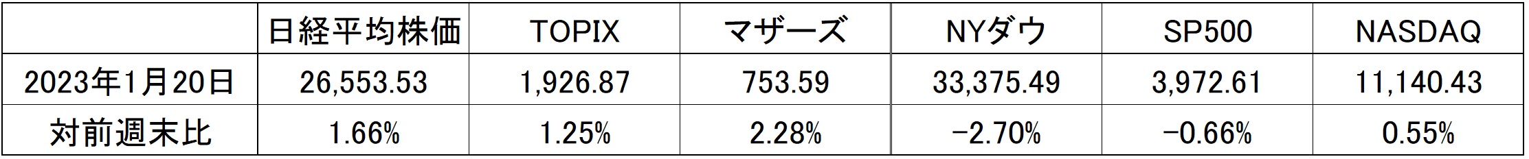 先週18日には日銀政策決定会合の結果発表があり、20日には総務省が日本の12月の消費者物価指数を発表した。米国では商務省が現地18日に発表した2022年12月の米小売売上高(季節調整済み)が2カ月連続で減少し、市場予想も下回ったことから、再び米国景気のダウンターンが懸念され、長期金利も低下、株価はNYダウで前日比613ドル(1.8%)安となるなど波乱含みとなった。日米株式市場の週間騰落率は下記通り。