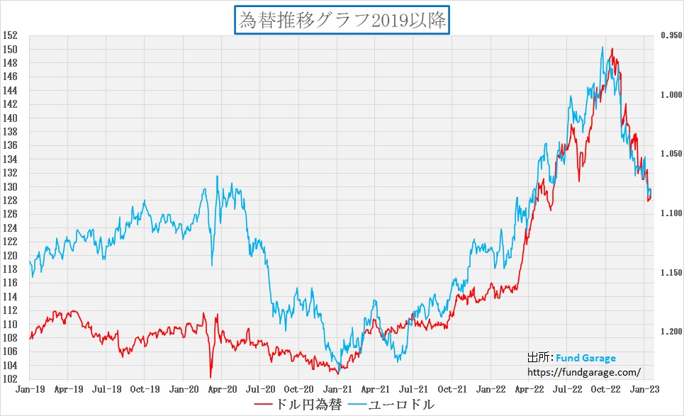 確かに、為替が「金利差」だけを反映して円安に動いたのであれば、金融政策の変更で「為替投機筋」へ驚きを与えることは出来るかも知れない。だが152円台をも見た円安が現値界隈(130円割れの円高)に押し戻されてきた背景には日銀の金融政策変更が影響したことは無い。そもそも下のチャートで明らかな通り、YCCの変動幅の変更タイミングでさえ、円高修正への時期とは重ならない。もし日本の金融政策が影響しているのであれば、ドル円と、日本は関係ない「ユーロドル」のトレンドがこれほどまでに一致することは無い。