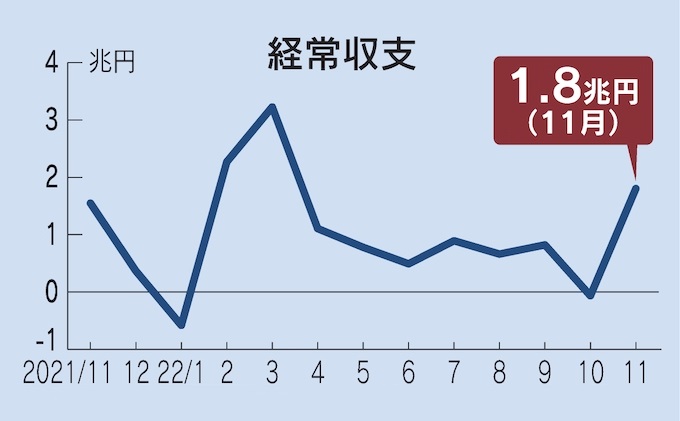 だから寧ろ輸出から輸入を差し引いた貿易収支や、外国との投資のやり取りを示す第1次所得収支、旅行収支を含むサービス収支などで構成する経常収支の方が関係が深くなっている。既に報じられている通り、財務省が12日発表した2022年11月の国際収支統計(速報)によると、貿易や投資などの海外との取引状況を表す経常収支は1兆8036億円の黒字だった。黒字額は前年同月から16.4%増え、11月として過去最大、但し前年同月を上回るのは8カ月ぶりという。海外子会社からの配当金の増加や訪日外国人の急回復による黒字が貿易収支の赤字を上回ったからだ。