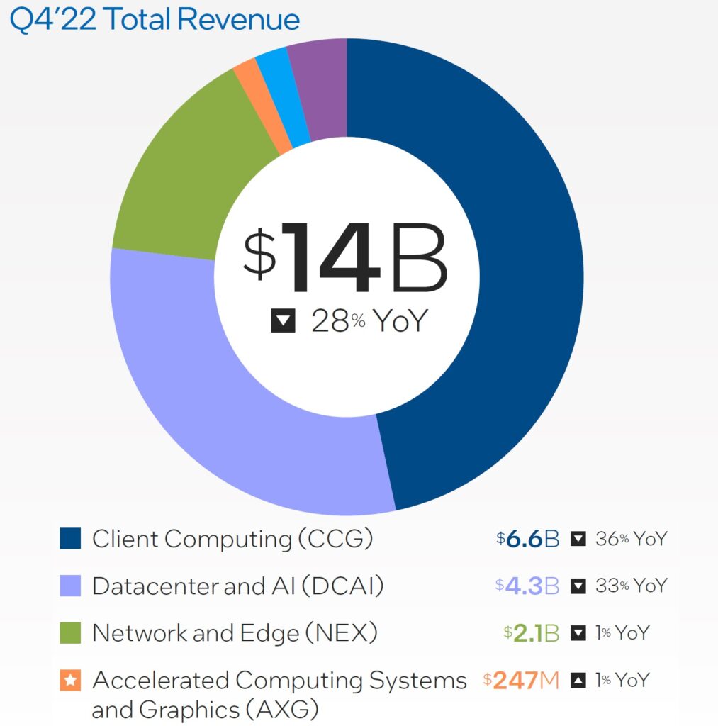 分かり易いように、まずはインテルのビジネス・セグメントを見てみよう。下記は同社の決算資料からだが、「CCG:Client Computing Group」と呼ばれるパソコン系のCPUビジネスが全Revenueの約47%、すなわち半分はパソコン市場の動向に影響を受ける(マイクロソフトも同様なセグメントが足を引っ張っていた)ということだ。そして今活況である「DCAI:Data Center and AI」は約30%しかなく、実はこの分野をドンドンAMDに浸食され、シェアを奪われている。