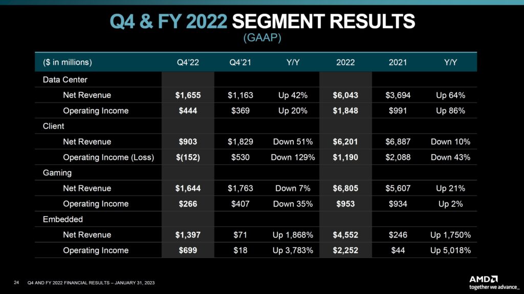 - For the first quarter of 2023, AMD expects revenue to be approximately $5.3 billion, plus or minus $300 million vs. 5.51B consensus, a decrease of approximately 10% year-over-year. Year-over-year the Client and Gaming segments are expected to decline, partially offset by Embedded and Data Center segment growth.