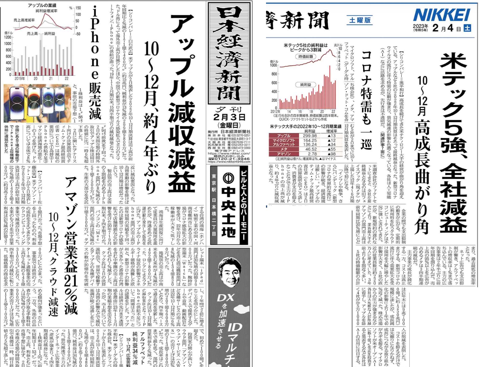 日経新聞の報じるところによると「『インフレや戦争、さらにパンデミック(新型コロナの世界的な流行)の影響が続き、経済環境は厳しい』。アップルのティム・クック最高経営責任者(CEO)は2日の決算説明会でこう話した。消費者が支出を抑えたことなどで主力のiPhoneの売上高が減り、約4年ぶりに減収減益となった。」だそうだ。しかし少なくとも、パブリックに行われた決算説明会でティム・クックCEOは「消費者が支出を抑えた」ことが減収減益の要因とは一言も言っていない。そもそも消費者の消費性向には言及していない。もし新聞が言う通り、消費者の消費行動の変化によるものが減収減益の理由だとしたら、少なくともこの決算を発表した翌日の本市場でアップルの株価は+2.44%も上昇しない。その他のGAFAM銘柄は若干ながら押し戻されて下落したのだから。