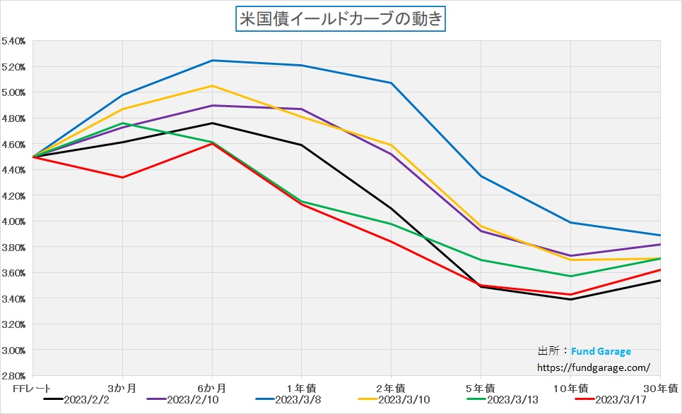 米国債の各年限における利回りをプロットしたイールド・カーブ、シリコンバレーバンク(SVB)の破綻以降の動きはかなりドラスティックなものとなった。まずはそのチャートを見て頂こう。各年限の上下の変動幅に注目して欲しい。