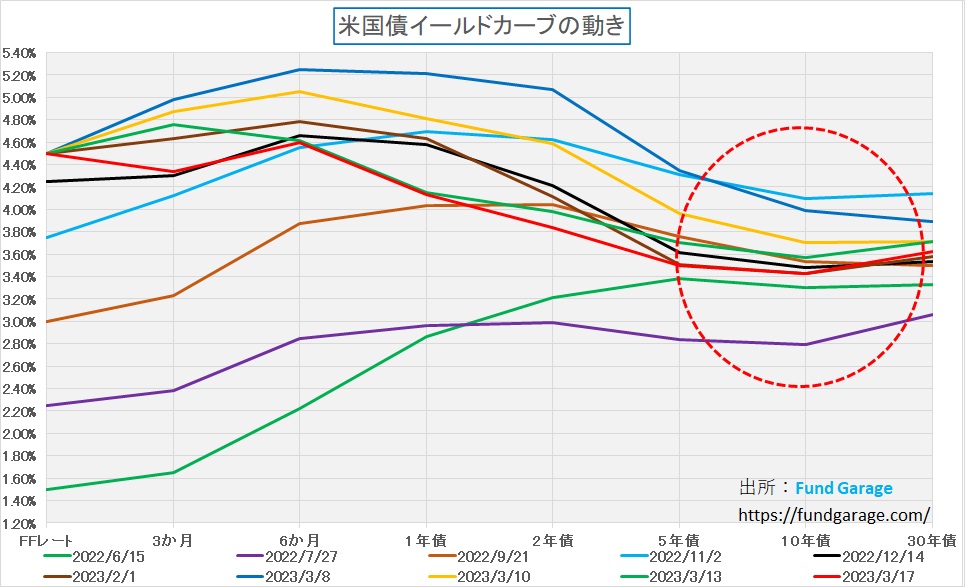 分かり易いように前掲のチャートと3月8日、10日、13日、17日の色は揃えてある。あとは各利上げタイミングのFOMCの時だ。確かに3月8日(最上端の紺色)は短期債利回りを中心にこの1年間でも一番高いところにあるが、そのイールド・カーブでさえ、10年債利回りでは最も高い訳ではない。つまり、2022年11月2日に、より高い利回りを経験しており、その時の方が長期債の評価損は大きかっただろうということだ。そして現時点で10年債利回りはほぼほぼ6月のFOMCの時の水準にまで低下している。