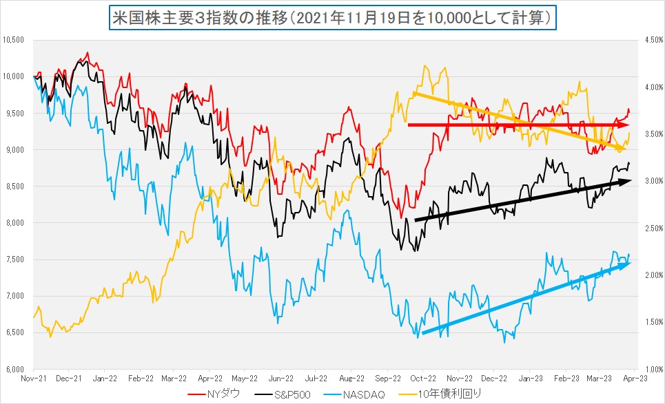 株価も金利も毎日当然上がったり下がったりを繰り返す。実はその都度都度の理由を考えるのはナンセンスな作業だ。何故なら、日々の価格変動は往々にして需給で決まるからだ。だが、それをある程度の長さの期間にしてみると、トレンドが見える時がある。長期にすればまず間違いなくトレンドは示されるが、短期的にも見えてくる時がある。上掲の金利推移と同じ期間の米国株主要3指数の動きを見ると、昨年の11月前後にはあらたなトレンドが出始めていたことを再確認出来る。