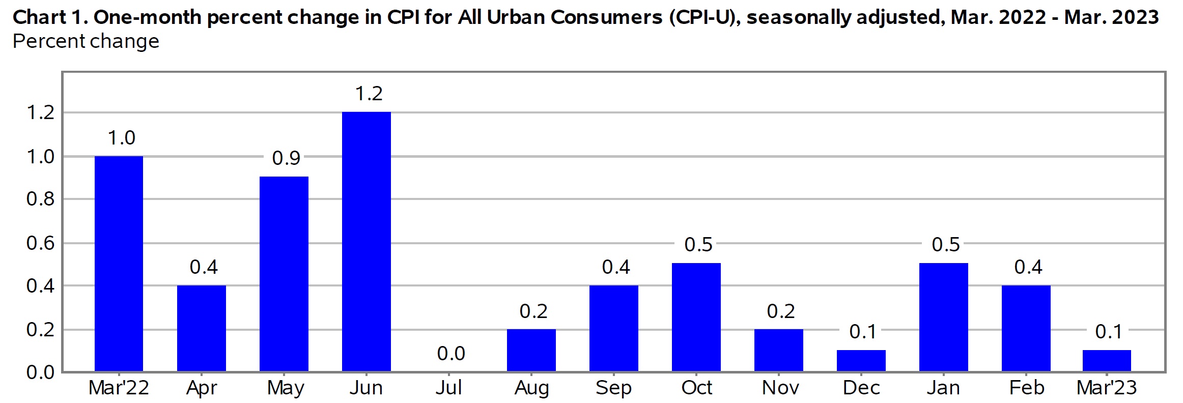 これを対前月比で見ると、3月は+0.1%と徐々に低下してるのだが、実際にはガソリン価格の低下が大きいようだ。まず対前月比で「All Items」の低下トレンドを下のチャートで視覚化してみるとこんな感じになる。少なくとも昨年よりは大きく利上げ効果が出ているようにも見える。実はこれも米労働省が発表している資料のチャートだ。