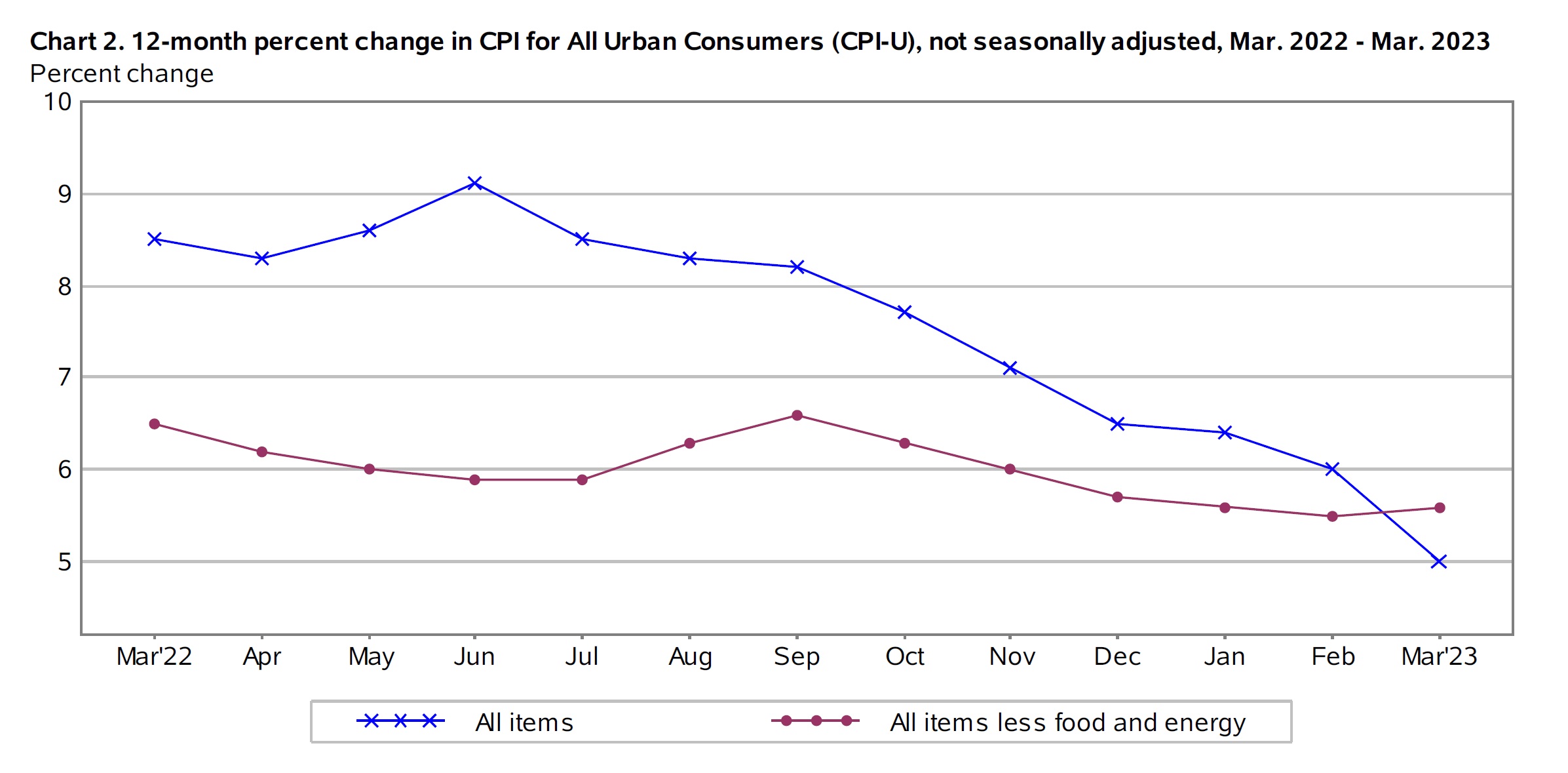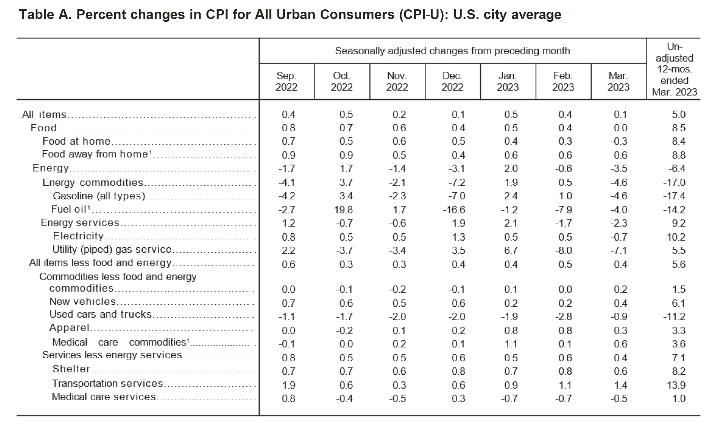 米労働省が12日発表した3月の消費者物価指数(CPI)は前年同月比の上昇率が5.0%となり、9カ月連続で鈍化した。市場予想は5.1%だった。今後は金融不安を受けた米銀による融資の厳格化が企業活動を冷やし、物価の下げ圧力となりうるというのがある意味では悲観論だ。まずはこちらの表から見て貰おう。米労働省が発表した数値の一覧だ。一番右側の数字列が対前年同月比(ALL itemsは一番上)。だが、市場を悩ませたのは、この表の中間あたりにある「All items less food and energy」(全ての項目から食品とエネルギーを除いたもの)という項目。見ると5.6%となっており、これは2月の6%も低いには低いが、それに大きく貢献したのはガソリンの△17.4%が鎮座していることがわかる。