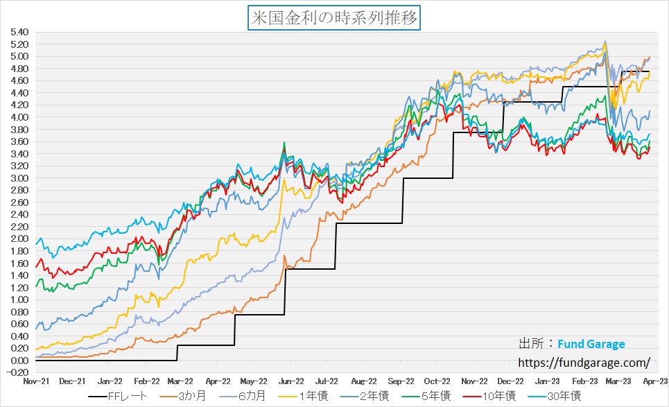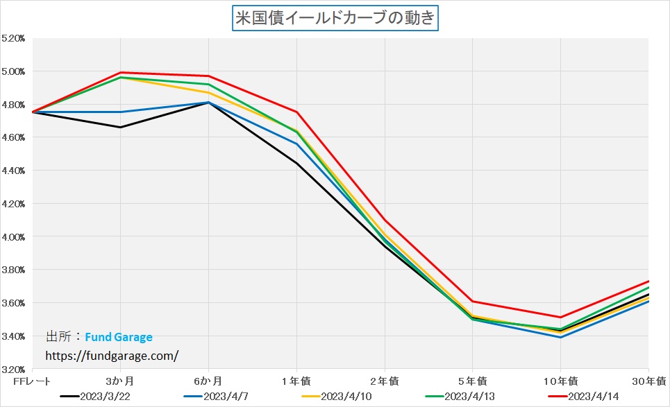 このチャートから明らかなことは、前回の3月17日の利上げの前に市場金利が急落していること。それはシリコンバレーバンクの話がきっかけであり、クレディ・スイスの吸収合併の話題が止めとなった。ストンと金利は一旦は急低下しているが、実は3カ月利回り、6か月利回り、1年利回りは急低下のあと、ジワジワと水準を戻していることも見て分かる。ただ逆に2年債、5年債、10年債及び30年債利回りはイメージとしては横這いだ。その中で先週はグイとかま首をもたげた感がある。