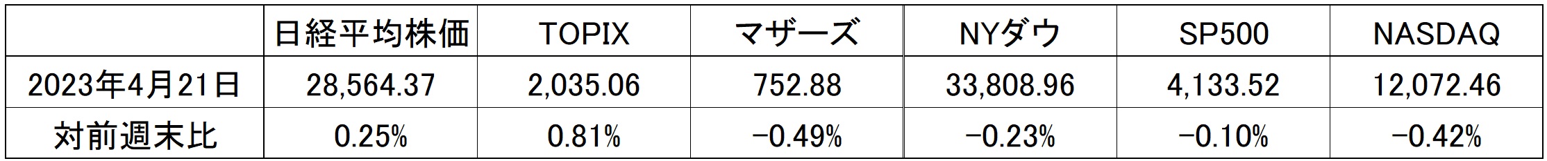 市場は完全に膠着状態に入った。下記の週間騰落率を見て貰えば一目瞭然だが、各インデックス揃って変動率の絶対値は1%にもなっていない。というよりは、市場参加者も動けないのだろう。決算発表とマクロ経済統計、どちらもまだら模様なものばかりで判断が難しい状況だからだ。例えば米国市場については「金融不安⇒米経済リセッション(景気後退)突入」という悲観シナリオがある。もし先週初に発表された米国大手銀行(JPモルガン(JPM)、BofA(BAC)、ウェルズファーゴ(WFC)、シティグループ(C))の決算内容が芳しくなく、今期見通しなども暗いものが発表されていたら、きっとその悲観見通し通りに市場はリセッション(景気後退)を危惧して値を崩したはずだ。だが悲観派には気の毒だったが米銀大手4行の決算は予想以上に強く、見通しも明るかった。逆に半導体の受託生産世界最大手、台湾積体電路製造(TSMC)が20日に発表した4-6期決算(第2四半期)の売上高見通しは市場予想を下回った。モバイルとパソコン市場は底打ち、あるいは安定化しつつあるとしながらも、現状はスマートフォン向けからサーバー用に至るまで半導体需要の低迷が続いており、半導体製造請負業界の需要は当面「軟調」となる見通しだと警鐘を鳴らした。これならハイテク関連銘柄は本来下落しそうだが、同社が2023年の設備投資については最大360億米ドル(約4兆8400億円)と従来計画を据え置いたことで、半導体製造装置関連銘柄を中心に寧ろハイテク関連銘柄の株価はしっかりした展開となった。それは当然日本市場にも影響した。これを受けて週末21日午前の日本市場は日経平均が一時28,700円台後半を付けて取引時間中として今年の最高値を更新した。また先週末に発表になった4月の米総合購買担当者景気指数(PMI)速報値は53.5(50以上が好況不況の境目)と昨年5月以来11カ月ぶりの高水準を示し、これは5月のFOMCでの利上げ懸念を想起させた。結果、市場は株を買うに買えないという感じを醸し出している。だが、恐らくそれもGAFAMの決算発表が一巡するこの週末には峠を越え、そして来週のFOMCでは答えが明確になるであろう。正直に本音を言えば、私はなぜ市場がそんなに悲観論を気にしているのか分からない。もしかすると市場は「買いたいための弱気」なのかも知れない。ただ、嵐の前の静けさと言う人がいるのは事実。だが明確な右肩上がりのビジネストレンドが二つもある以上、弱気になって引き下がる気は毛頭ないというのが私の本音だ。