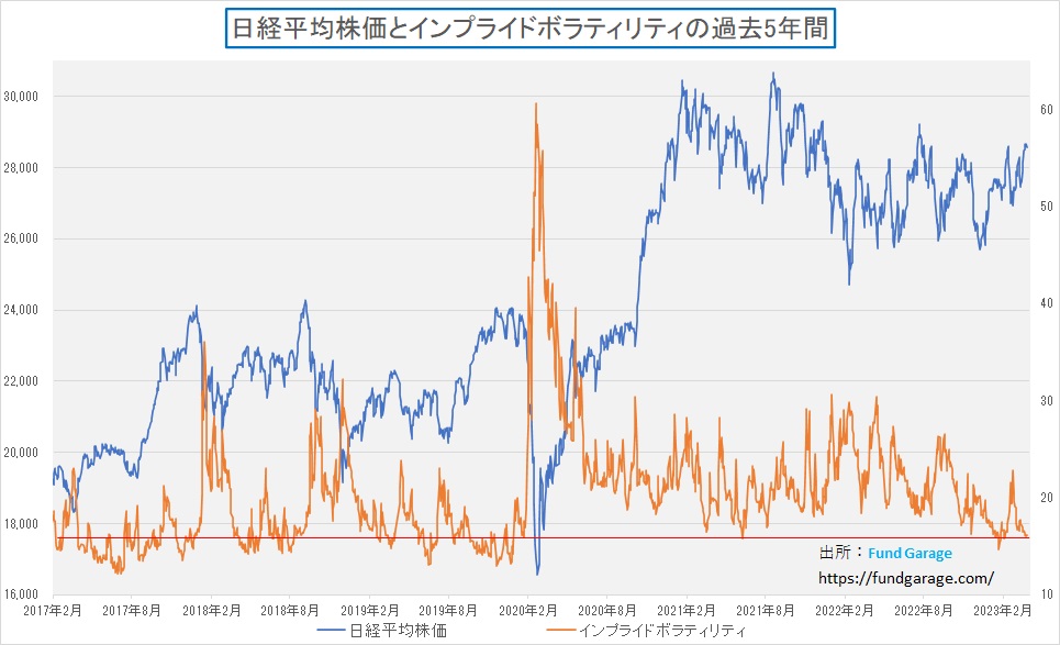 ご承知の通り、インプライド・ボラティリティとは、その原資産を参照するオプション価格から、その5つの決定要素(株価、行使価格、残存期間、金利、ボラティリティ)の中で既知のもの4つ、すなわち株価、行使価格、残存期間、そして金利を使って逆算して求めるものだ。実際に市場で取引されているオプション価格は「市場がこの先の変動率(予想変動率)をどの程度を見通しているか」が織り込まれているという理屈が通る。オプション価格を決める場合に使われるのは、参照指数のヒストリカル・ボラティリティからの推計値が使われる。経験則的には通常インプライド・ボラティリティが恒常的な水準よりも低いゾーンに入ってきた場合、「市場が緊張感なく弛みきった状態」ということで、一触即発で寧ろダウンサイドリスクが高いと分析されることが多い。