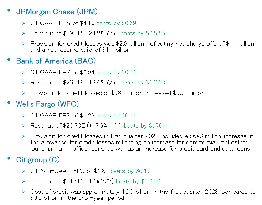 先週発表になった米国大手上位4行の決算内容は全て揃ってEPSもRevenueも市場予想を上回るものとなった。またJPモルガンを筆頭に通年のNII(net interest income:銀行の預金金利と貸出金利のスプレッドから収益)ガイダンスも良好だった。JPモルガンはNIIガイダンスを従来の730億ドルから810億ドルへと引き上げている。更にCEOのジェイミー・ダイモンは、「米国経済は引き続き全般的に健全な状態にあります。消費者は依然として支出を続けており、健全なバランスシートを維持しており、企業は良好な状態にあります。」とまで言っている。冒頭お伝えしたように「金融不安⇒米経済リセッション(景気後退)突入」という悲観シナリオは全く成り立たたなくなっている状況だ。そもそもシリコンバレーバンク(SVB)の破綻を曲解して大騒ぎし過ぎだと常々思っていた。そもそもあの例は銀行の基本的なALMが出来ていないという特殊なケースだったからだ。