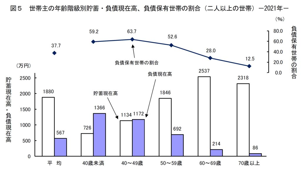 因みに、総務省統計局のホームページから、家計調査のデータを下記に示す。40歳未満のところを見ると、負債が貯蓄に比べて約600万円超は多いのが分かり、その保有世帯比率は59.2%、3世帯に2世帯は負債を抱えている。もしその負債超過部分の金利がいきなり5%や7%になったら何が起きるだろう。確かに60代以上、O氏のように80歳代にもなれば、負債は無く貯蓄だけ、おまけに今の80歳代の人は60歳になった時点から綿々と年金も貰っているのだろうから、金利上昇は万々歳なのかもしれない。だが住宅ローンを抱えた世帯は返済負担がその分増える(期間が長くなるなど)のは自明。
