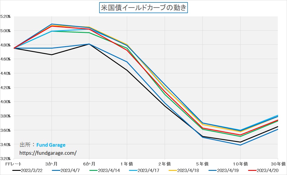 これはJPモルガンCEOのコメントを図らずも裏付けるようなものだ。実際、米債券市場ではほぼ完全に5月のFOMCでの0.25%の利上げは織り込んでいると言える。それを裏付けるのがイールド・カーブだ。ご覧頂ける通り、全く狭いレンジで高止まりしたままだ。