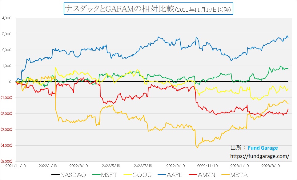 またもう一つの証左となる動きがGAFAM5銘柄の動きにもある。下のチャートでご覧頂ける通り、久しく長く、ナスダックの中に合ってお荷物(足を引っ張る)となっていたアマゾンドットコム(AMZN)の株価運び(赤い線)だが、減速しないマクロ景気の中で、市場が予想したよりも祖業であるネット通販部門が好調だという話が伝わってきている。当然、前回お伝えした「株主への手紙」などへの理解も拡がっている。それを映してか、株価はナスダックを徐々にアプトパフォームし始めているように見える。MFCLが故の贔屓目、あばたもえくぼ、ではないことを願ってもいるが・・・。
