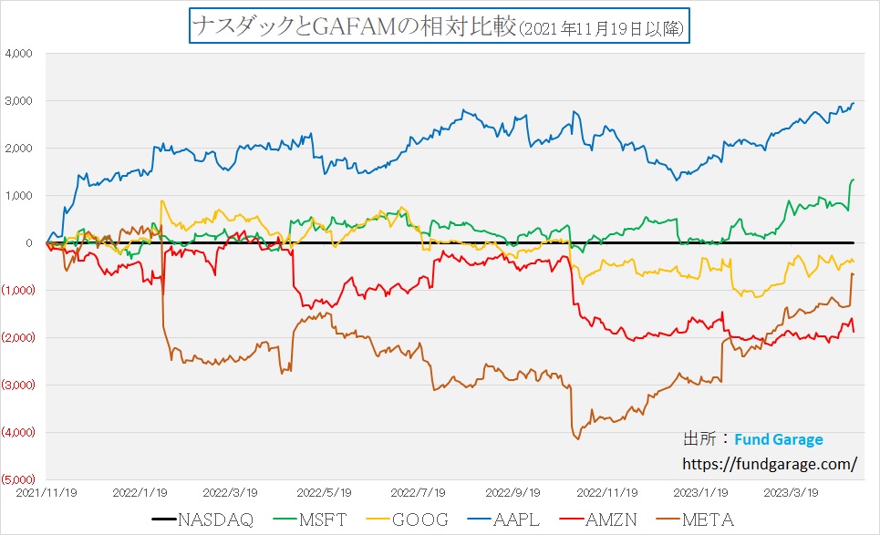 下記のチャートはGAFAM5銘柄の対ナスダックの相対パフォーマンスだが、目立って元気になったのが緑のマイクロソフトと、茶色のメタプラットフォームズだ。アルファベットも悪くない動きをしている。残念ながら、アマゾンドットコムの決算発表については、市場は期待に反したと捉えたようだが、後述する通り、それは短絡的な見方だと思われる。だとすれば、米国がリセッション(景気後退)に向かっていると言われようが、この先の見通しは暗くない。やはり鍵を握るのは「Generative AI(生成AI)」だろう。