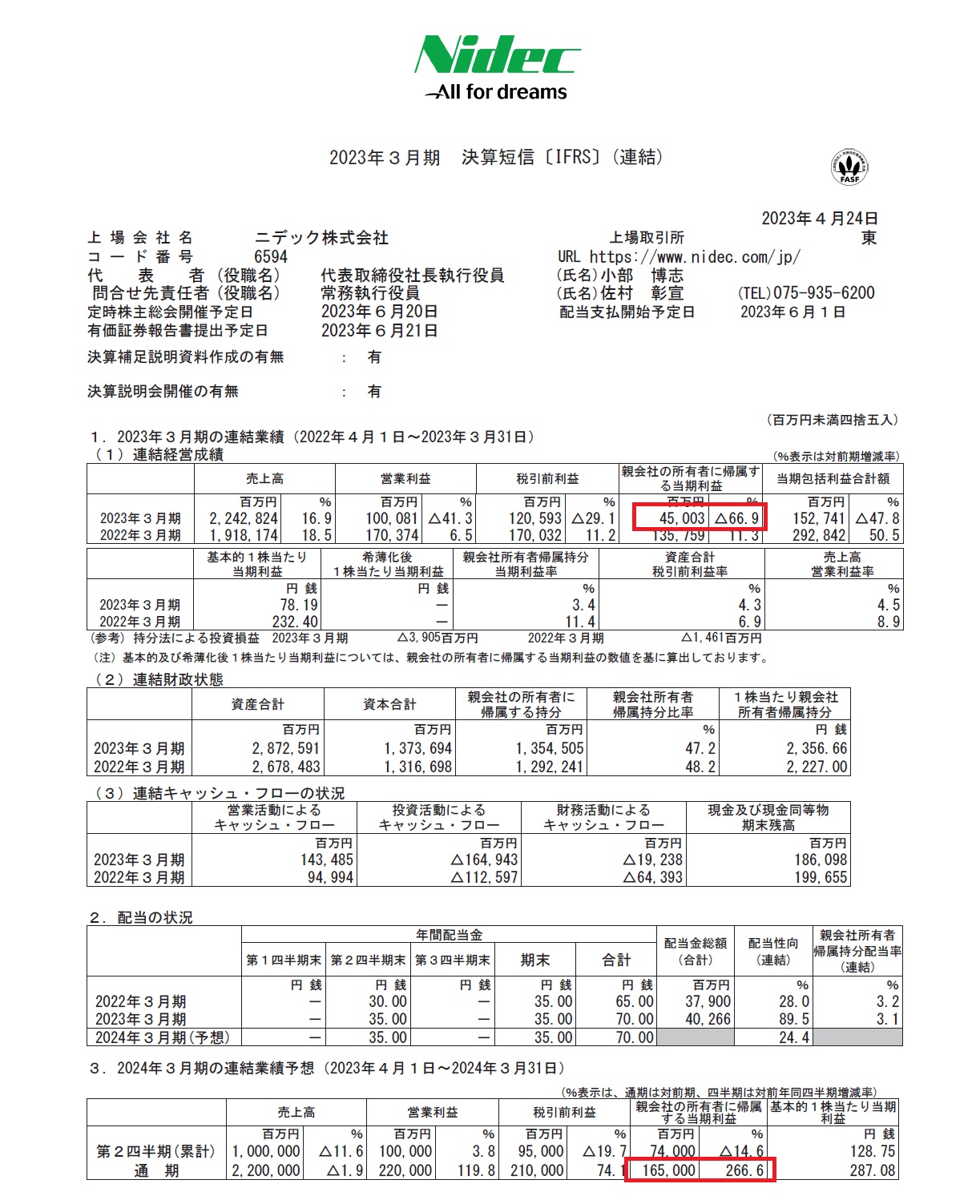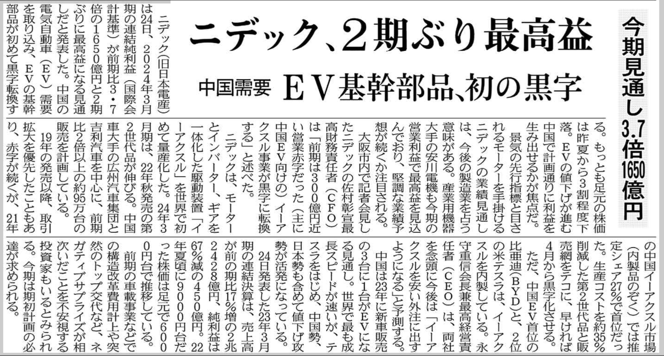 また見出し下段の「中国需要 EV基幹部品、初の黒字」とあるが、実はこの文言を担保する説明が決算短信には無い。ならばその根拠は何だろうかと探るとどうやら発表時の記者会見(クローズド)の中で「大阪市内で記者会見したニデックの佐村彰宣最高財務責任者(CFO)は『前期は300億円近い営業赤字だった(主に中国EV向けの)イーアクスル事業が黒字に転換する』と述べた」とあることだけのようだ。という事は、2期ぶりに最高益となるというのも、イーアクスル事業が黒字化するというのも、実績の話ではなく単なる会社側の期待値の話。ならばその根拠となる考え方を投資家は検証してみる必要があることは言うまでもない。