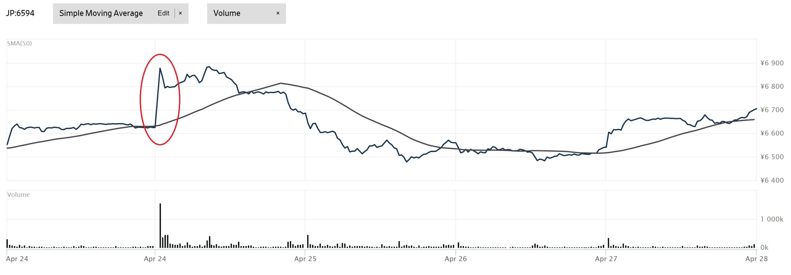 実際には24日の引け後に決算短信が公表され、翌25日朝刊にこの記事が掲載されたこともあり、25日のニデックの株価は朝から絶好調で値上がりした。それを示すのが下記の先週一週間の株価運びで、赤丸をつけたところがそれだ。先週一週間の内で火曜日のそこが最高値となっている。正直、これは酷い話だなと言わざるを得ない。もちろん、2024年3月期決算でこの見通しが正しいことが証明されるならば、株価は上昇し、先週のどの値段帯で購入していたとしても、大きな利益を挙げることが出来るだろうと思われる。