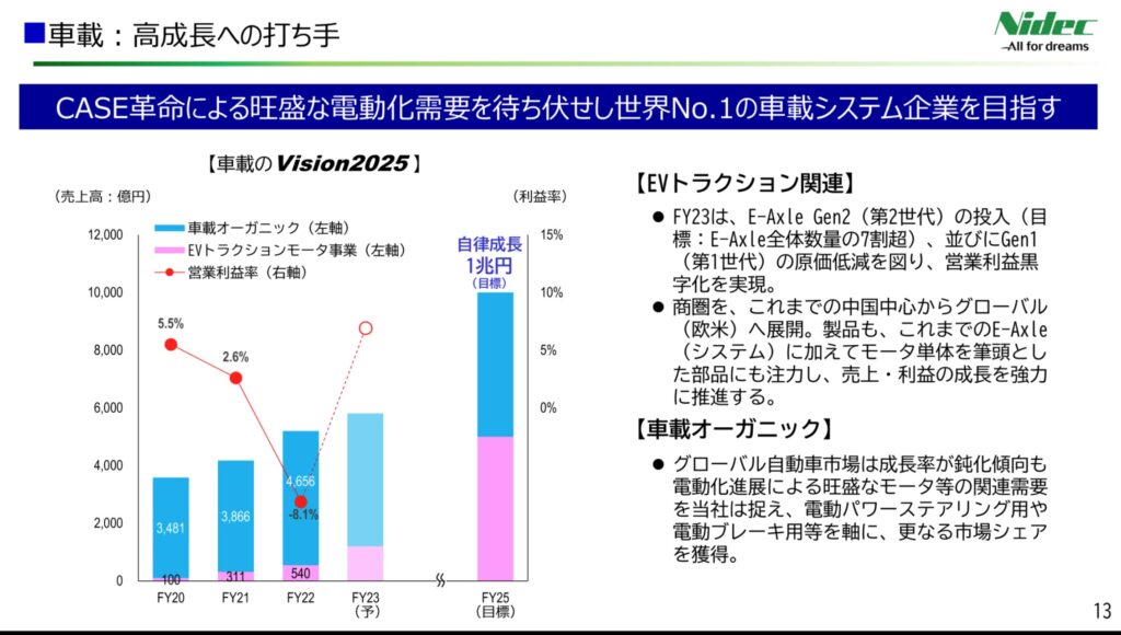 例えば、下のスライドだがまず営業利益率がFY22の△8.1%からFY23(予)では一気に+7%ぐらいまで上昇したように絵が書かれている。また「車載オーガニック+EVトラクションモーター事業」の合算がFY22が4656+540=5196からFY2025には約2倍の1兆円が自律成長だと示されている。どちらについても、充分な根拠が示されていない。
