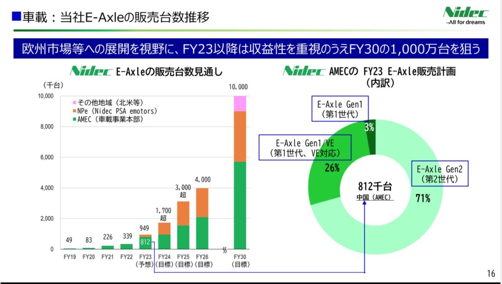 また別のスライドで説明しているE-Axleの販売見通しでは、FY22の実績値が339千台に過ぎないが、まずFY23でその3倍になると予想を立て、FY25にはFY22の実績の約10倍、FY30にはFY22の実績の30倍規模になる絵を示している。因みにE-Axleとはガソリン車で言うならエンジン部分。車1台に一つが使われるので、生産台数=クルマの台数ということになる。ならばニデックは2030年には世界で1000万台のBEV(電気自動車)向けのE-Axleを全部供給するというのだが・・・・。
