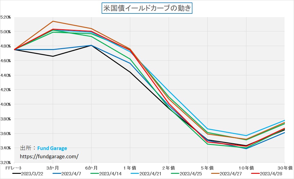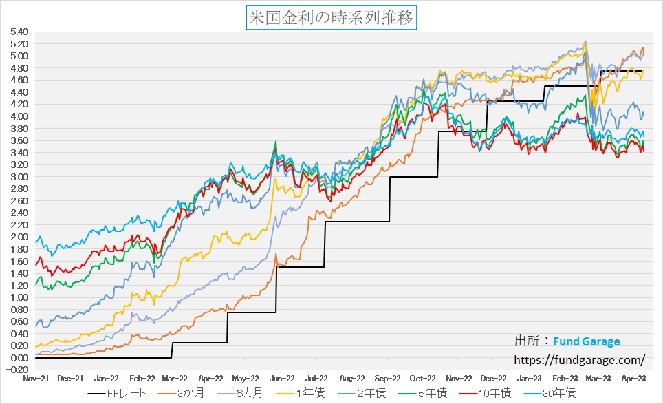 現在の米国債券市場が織り込んでいる米国経済の状況は、基本的に殆ど変化していない。下記に示す通り、米国債の5年債、10年債、30年債の利回り水準は、多少のアップダウンはあるにしても昨年の秋以降から大きな水準訂正は起きていない。FRBが期待する景気後退によって需要が低下し、労働市場が緩まる程度に景気が減速することを織込んだままにある。一方で期間1年以下の債券利回りは、シリコンバレーバンク破綻以降、上昇トレンドにあり、次回のFOMCでの利上げを織り込んでいる。