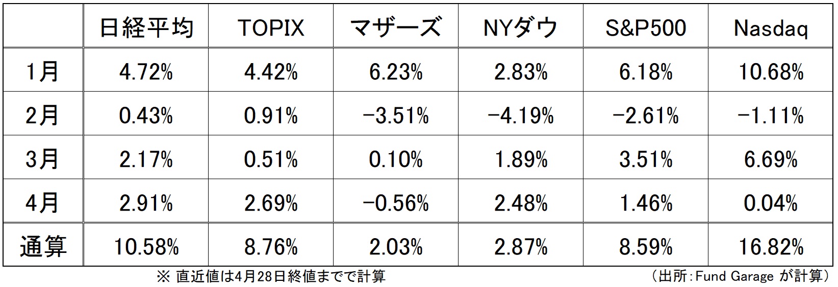 先月4月の月間騰落率が固まったので下記に掲示する。年初来の動きで見ると、存外に日経平均は健闘している。ナスダックの4月は強弱感が対立した感じだ。一番の困難さは「半導体減速ストーリー」と「生成AI成長加速ストーリー」が両立する中で、投資の観点での落としどころが見つけづらかったということだろう。ただこれらは後述するが、先週までに発表された主力企業、マイクロソフトやアルファベット、メタプラットフォームズにアマゾンドットコムなどの状況で概ね判断がつく。インテルやサムスン、或いはTSMCの決算などが多くのヒントも提供してくれた。日本では、日本電産、村田製作所そしてTDKといった電子部品関連企業のまだら模様に、多くのヒントがあった。