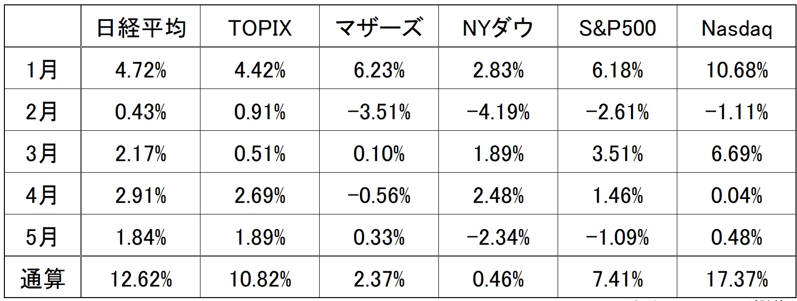 一方の米国株市場、5月の月次騰落率は下記に示すごとく、古典的な経済学者が好む「Sell in May」を体現するかのようにNYダウなどが下落している。ただこの「Sell in May」という格言は、そもそも「昔は裕福な投資家が夏の間は都市を離れ、その結果、取引活動が減少し、市場収益が低下するという考えに基づいている(The strategy was initially based on the notion that wealthy investors in the past would leave the city during the summer months, resulting in reduced trading activity and lower market returns.)」というのが正しい認識。