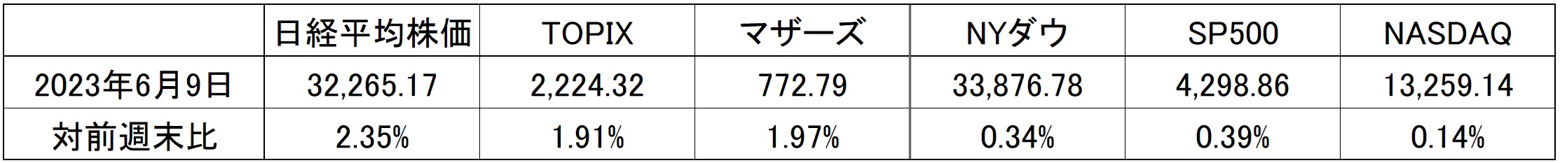 これらを通算した先週1週間の騰落率を集計すれば、下記の表の通りとなる。債務上限問題は一旦「休止」となったが、13日と14日に注目のFOMCを控えて殆ど上下変動がない(動けない)かのような米国株市場に比べて、日本市場はどのインデックスも上昇している。そして取り分け日経平均株価がひときわ大きい上げ率となったことがわかる。勇猛果敢なのか、単に蛮勇逞しいのかは今週後半には見えてくるだろう。